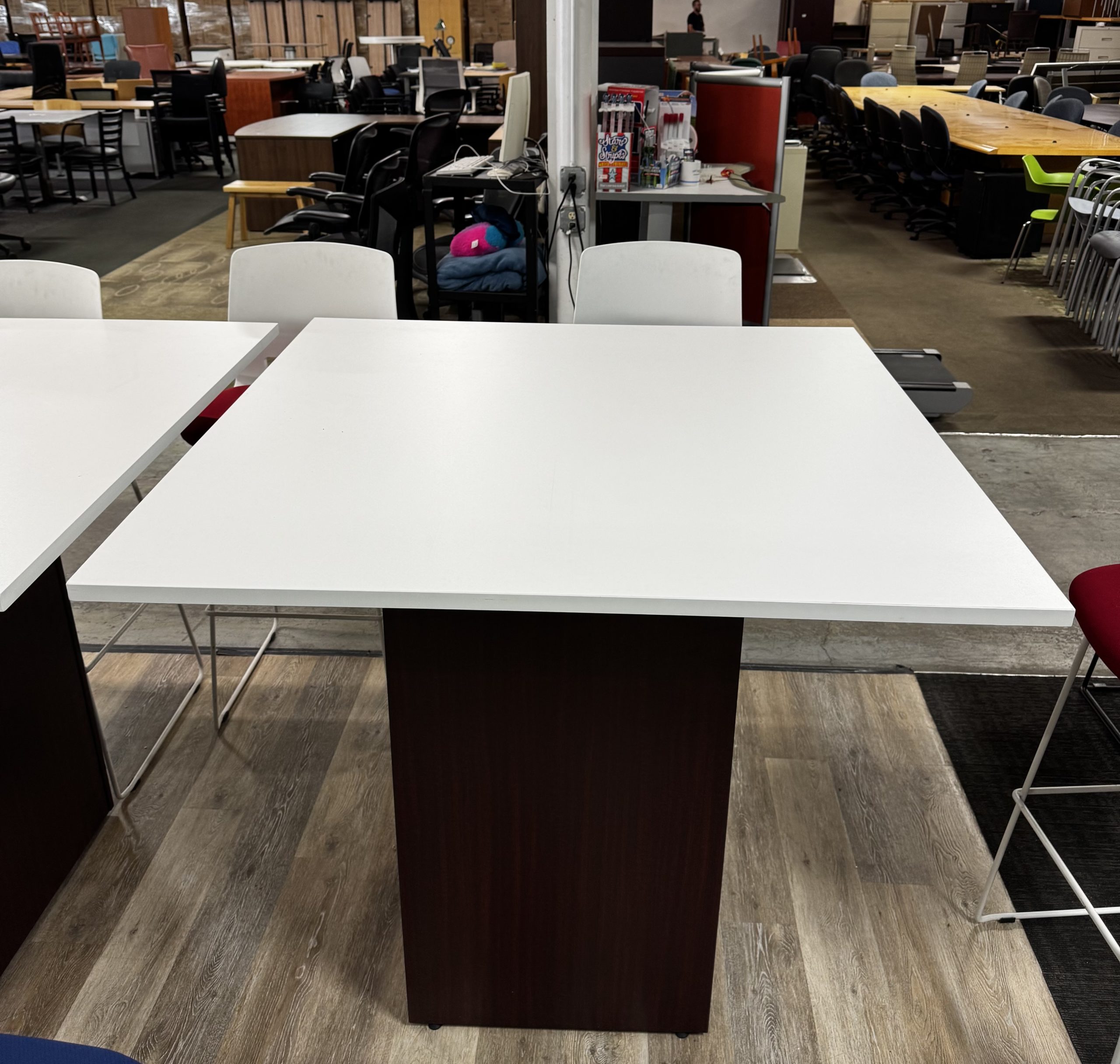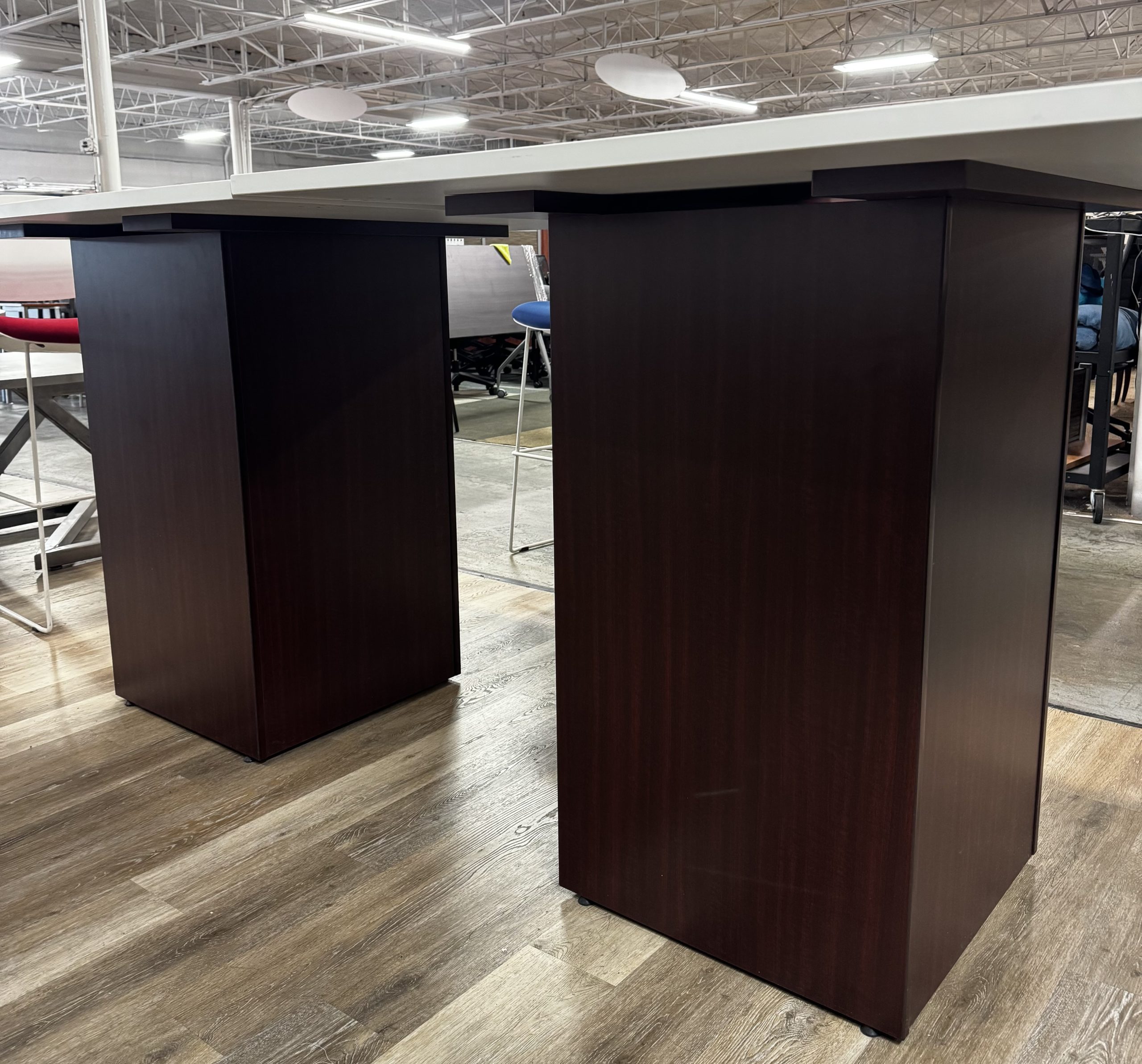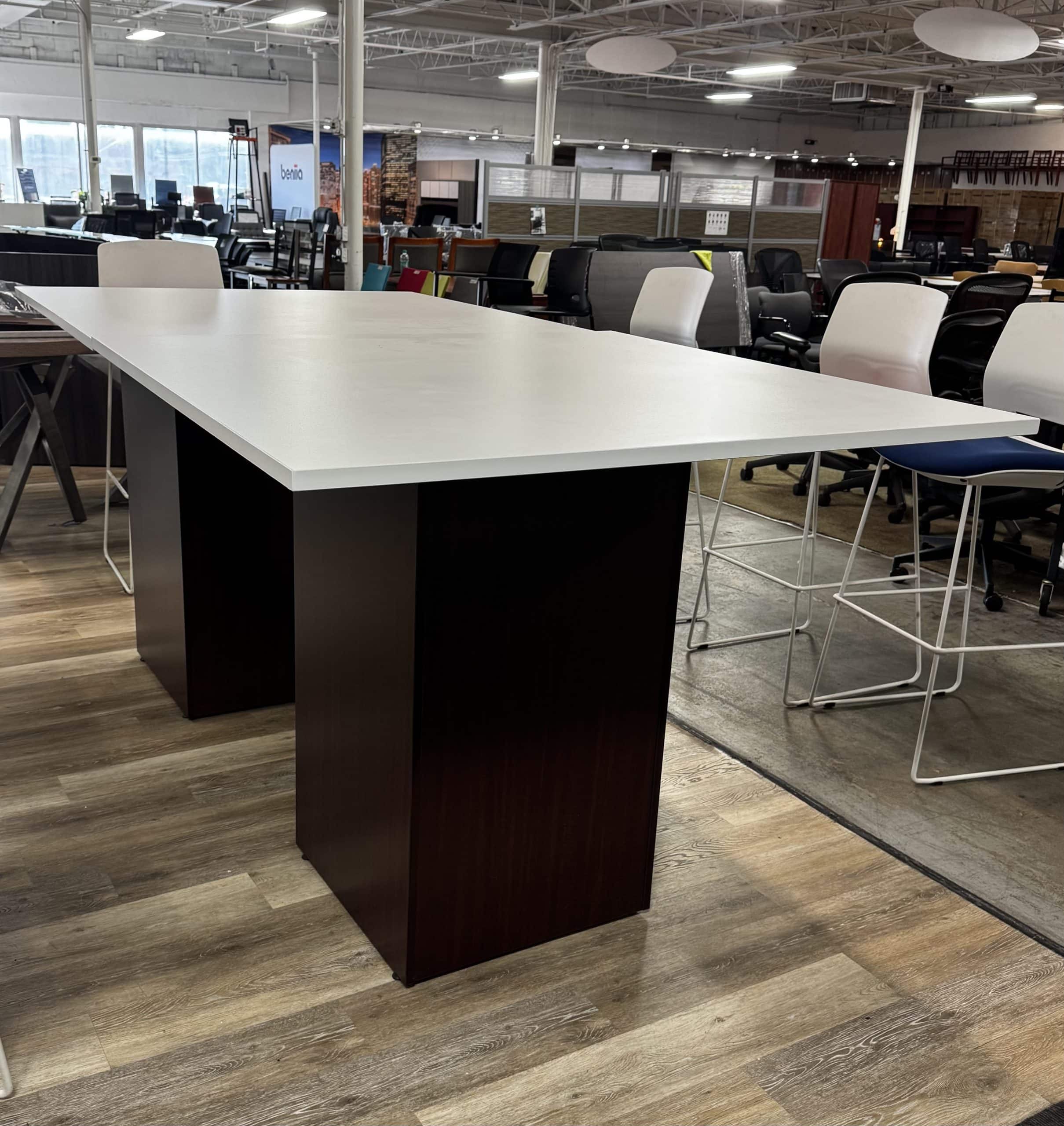 Upgrade your workspace with this versatile 96” x 48” x 41” high-top table, designed for both style and function. Featuring a sleek white laminate top paired with a rich mahogany base, this table brings a modern yet professional look to any office, conference room, or collaborative area.